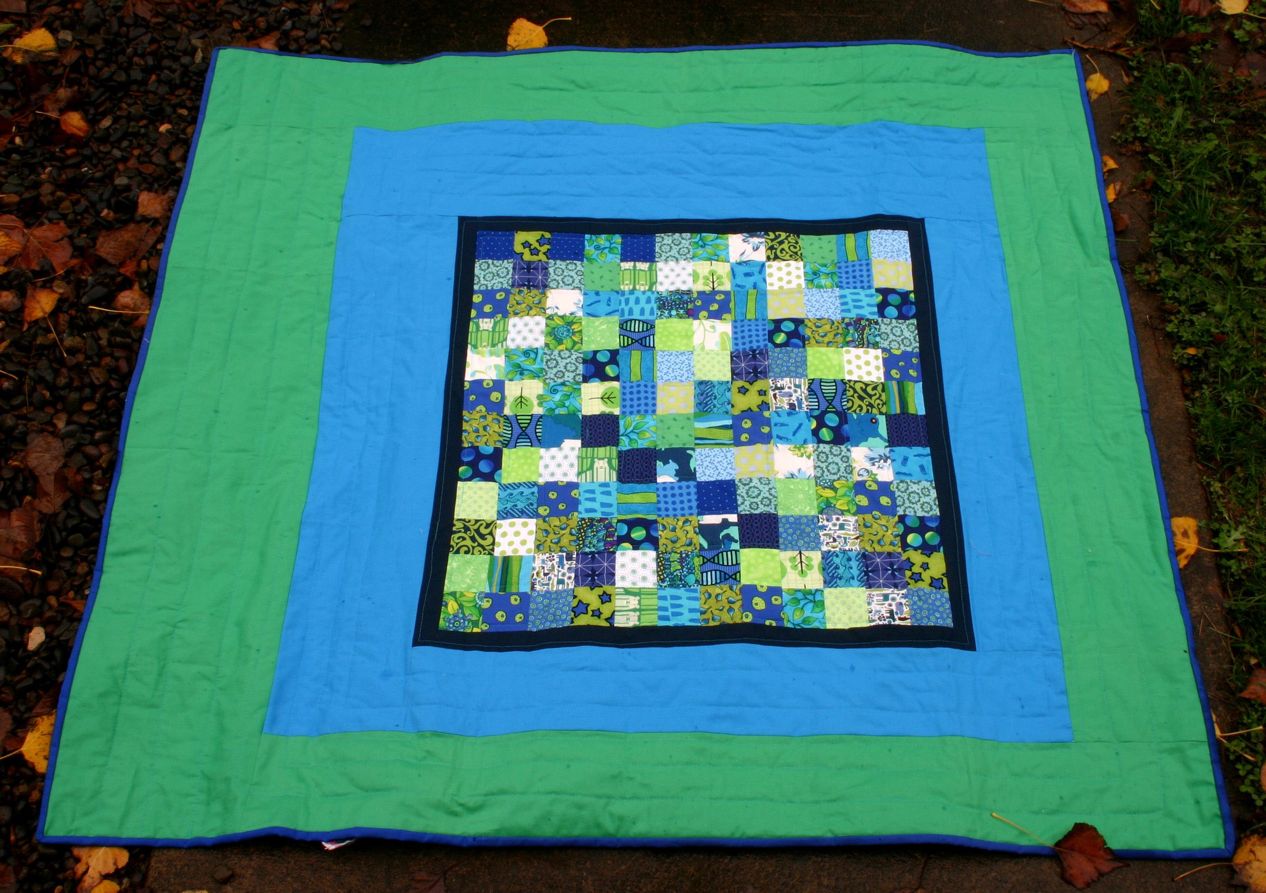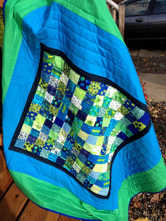 As I was finishing the quilt it was fun to see how the colour border size and shape affected the look of hte quilt.  I ended up trimming the quilt a couple of times to get a balance I was happy with.