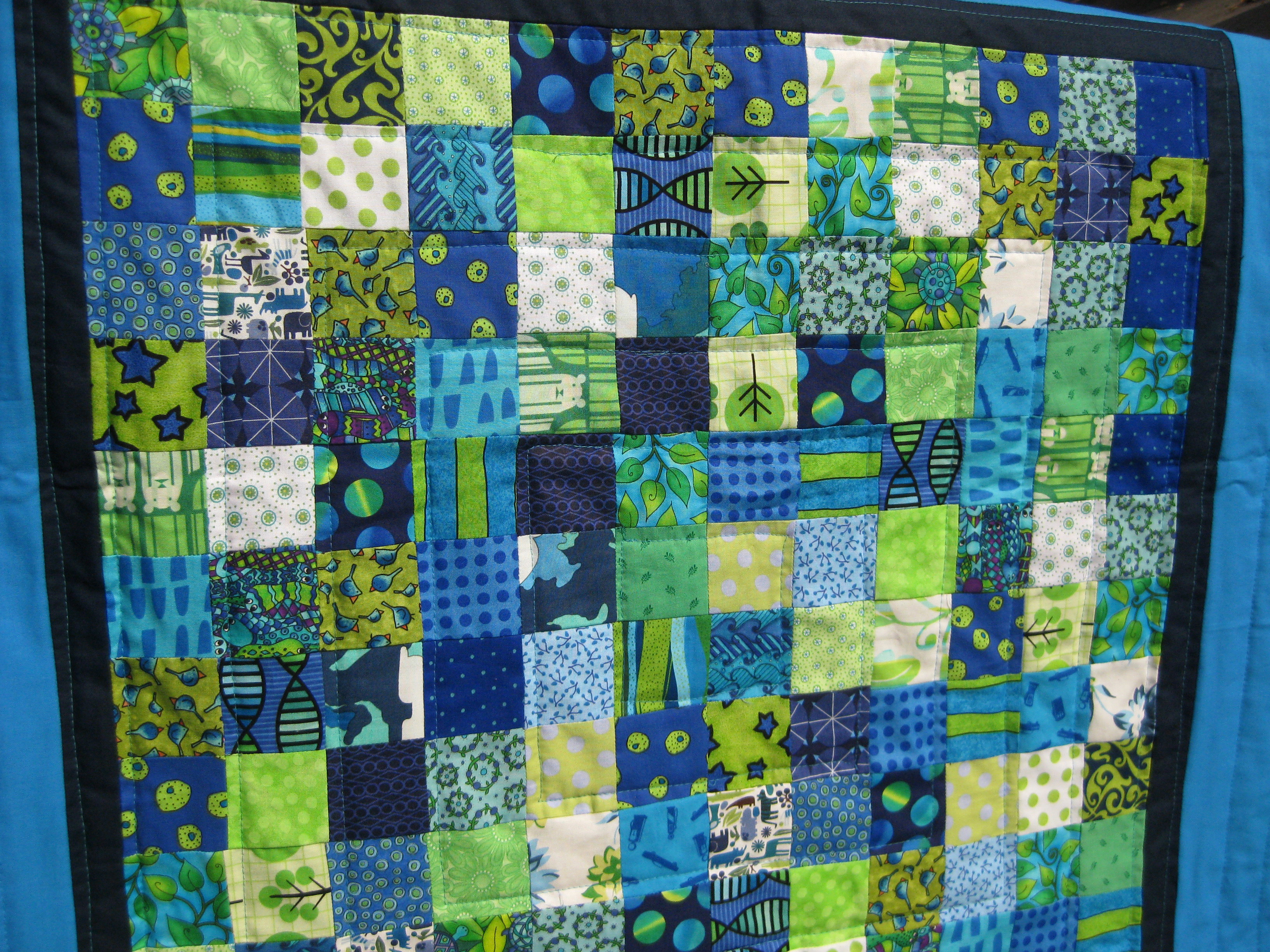 It did not turn out quite like I wanted, but it was a fun using a new pattern to make the blocks.  The center piece of the quilt was made using a quick four block pattern that was demonstrated to us at Project Linus.  I have attached a version of the pattern here.