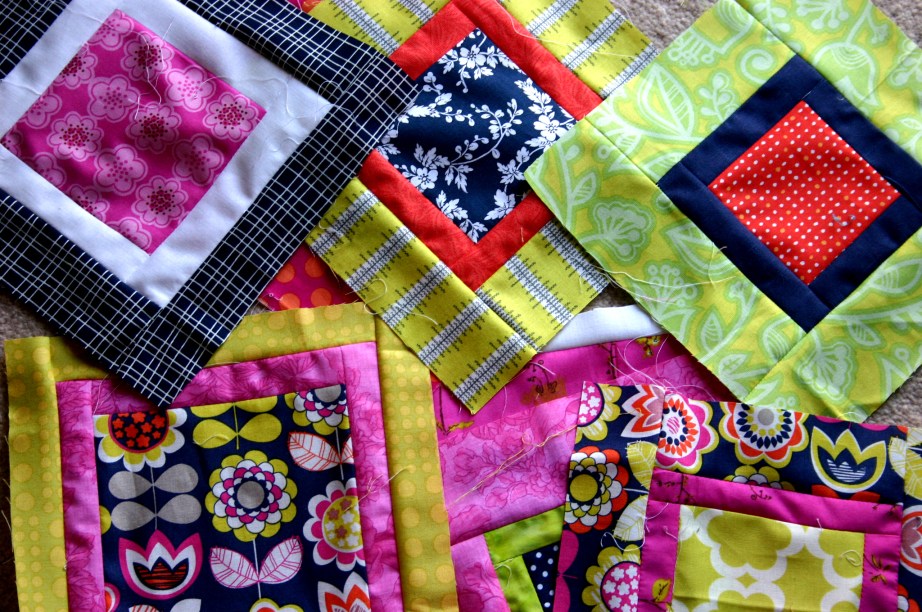 My inspiration for this quilt was a fun floral fabric I had found at Joann’s and I built the quilt around the colours from that fabric, using mainly scraps from my collection.  I made a collection of different square blocks, just doing what ever took my fancy.