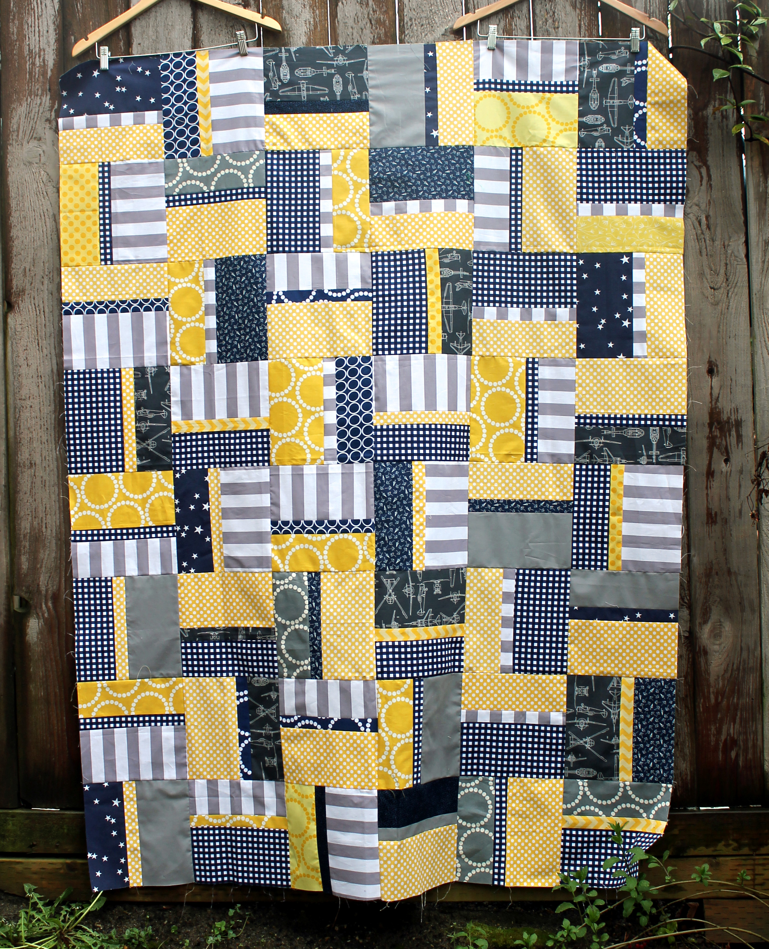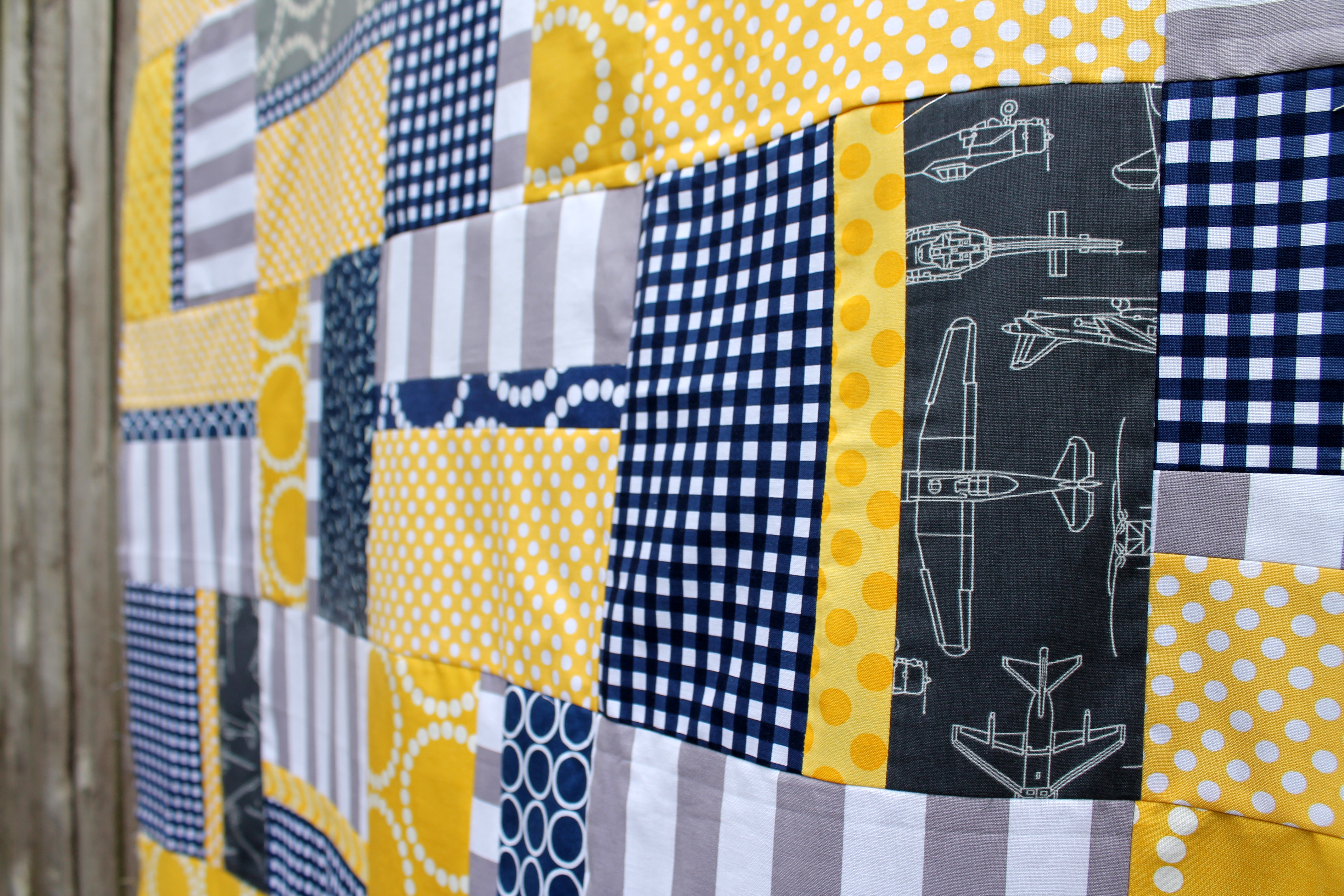 Michelle sewing awayWe had a collection of fat quarters and fat eighths left over from the Riley Blake challenge and our challenge was to make some quick and easy quilt tops out of them. Rachel from 2nd Avenue Studios and I spearheaded this adventure and we quickly settled on a modified rail fence and three of the fabrics from the Challenge – the yellow dot, the navy check and the grey stripe.