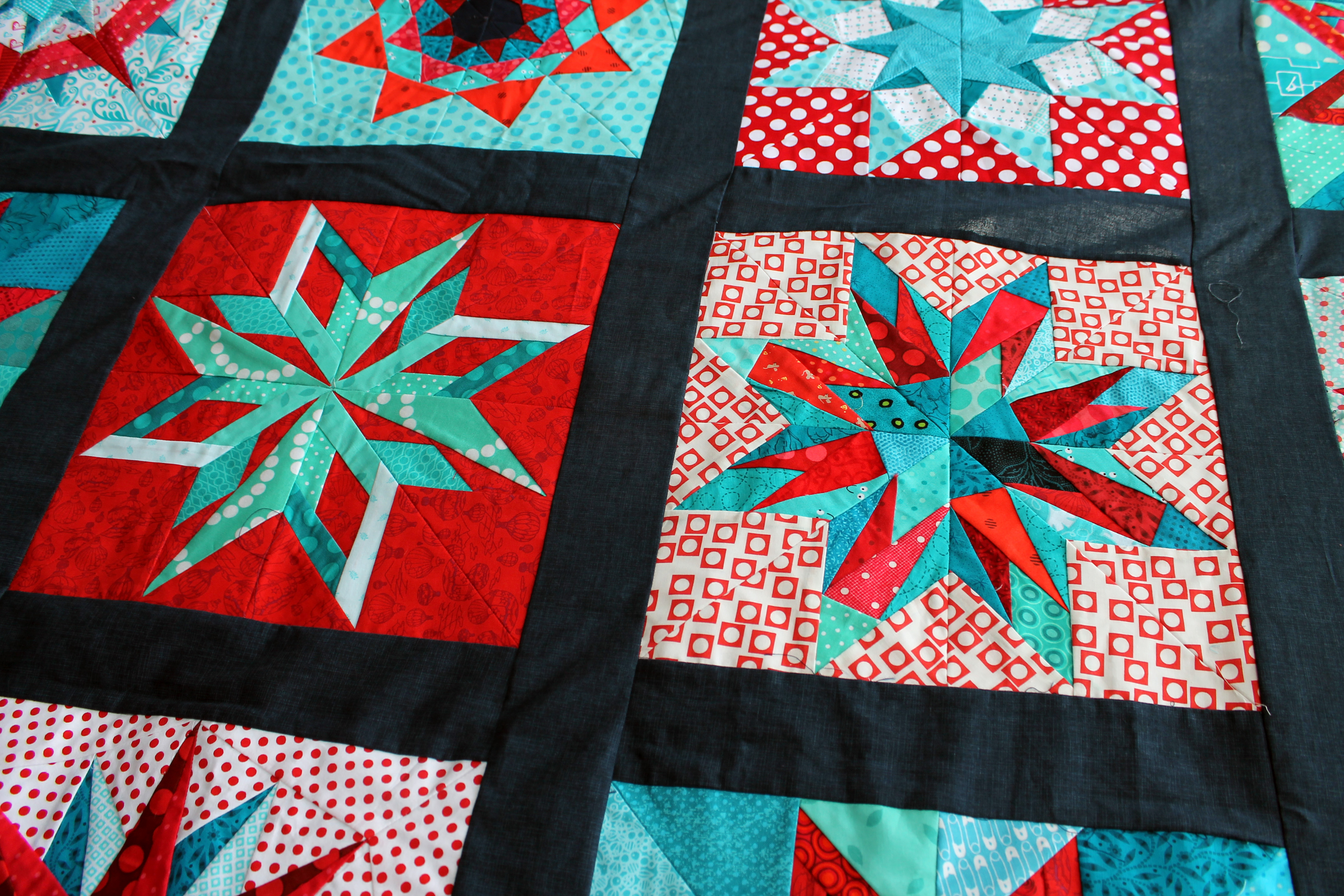 So lovely! The reds and aquas really pop against the navy sashing! I don’t envy you removing all those papers now though!
