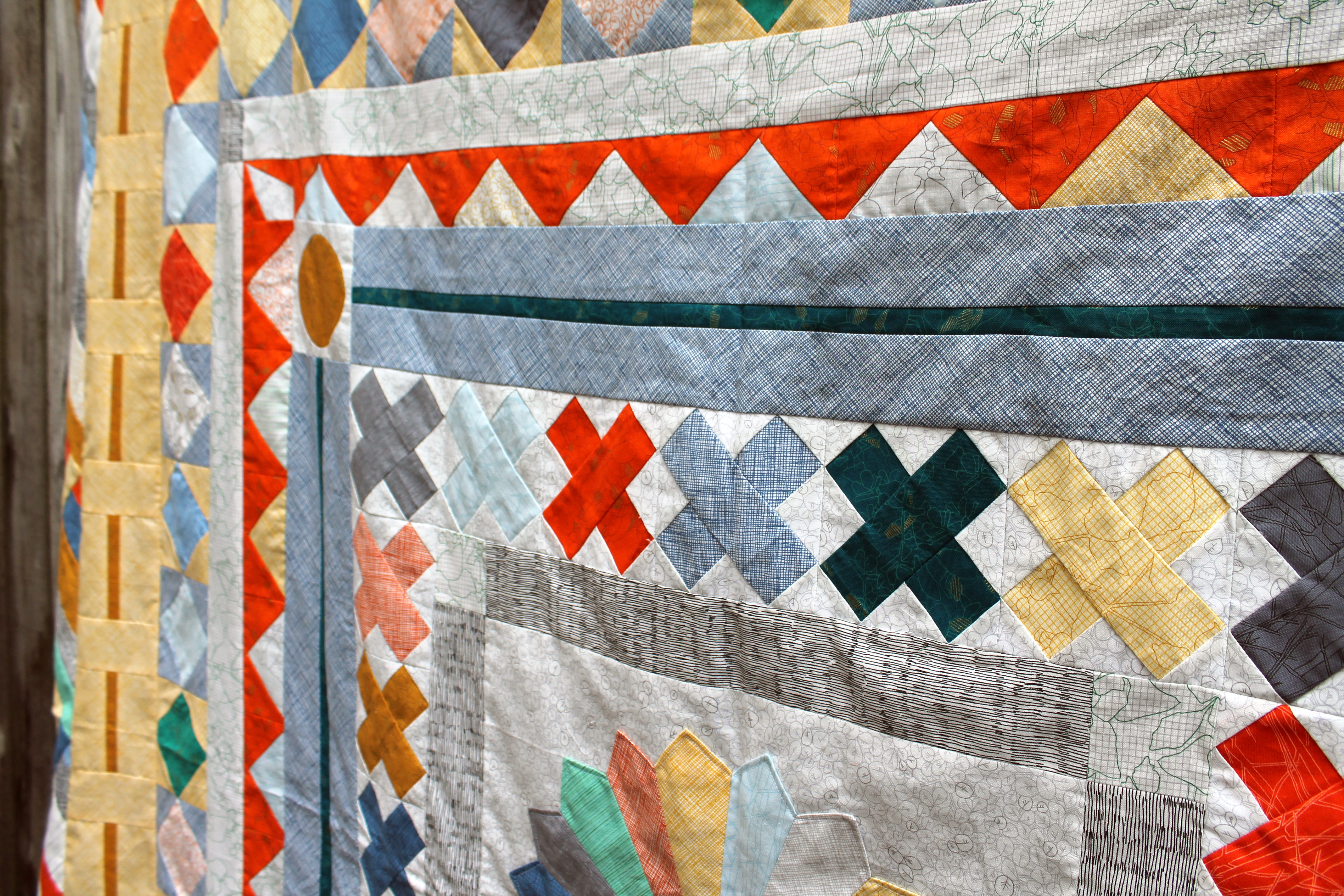 • I should say… the density of design is well done, balancing the shapes well. And I like the repeat of the solid line in the 3rd border farther out in the next-to-last border with the broken line. The Xs on point, squares on point, strip-piecing (piano keys?) on point, also good echoing of shape.