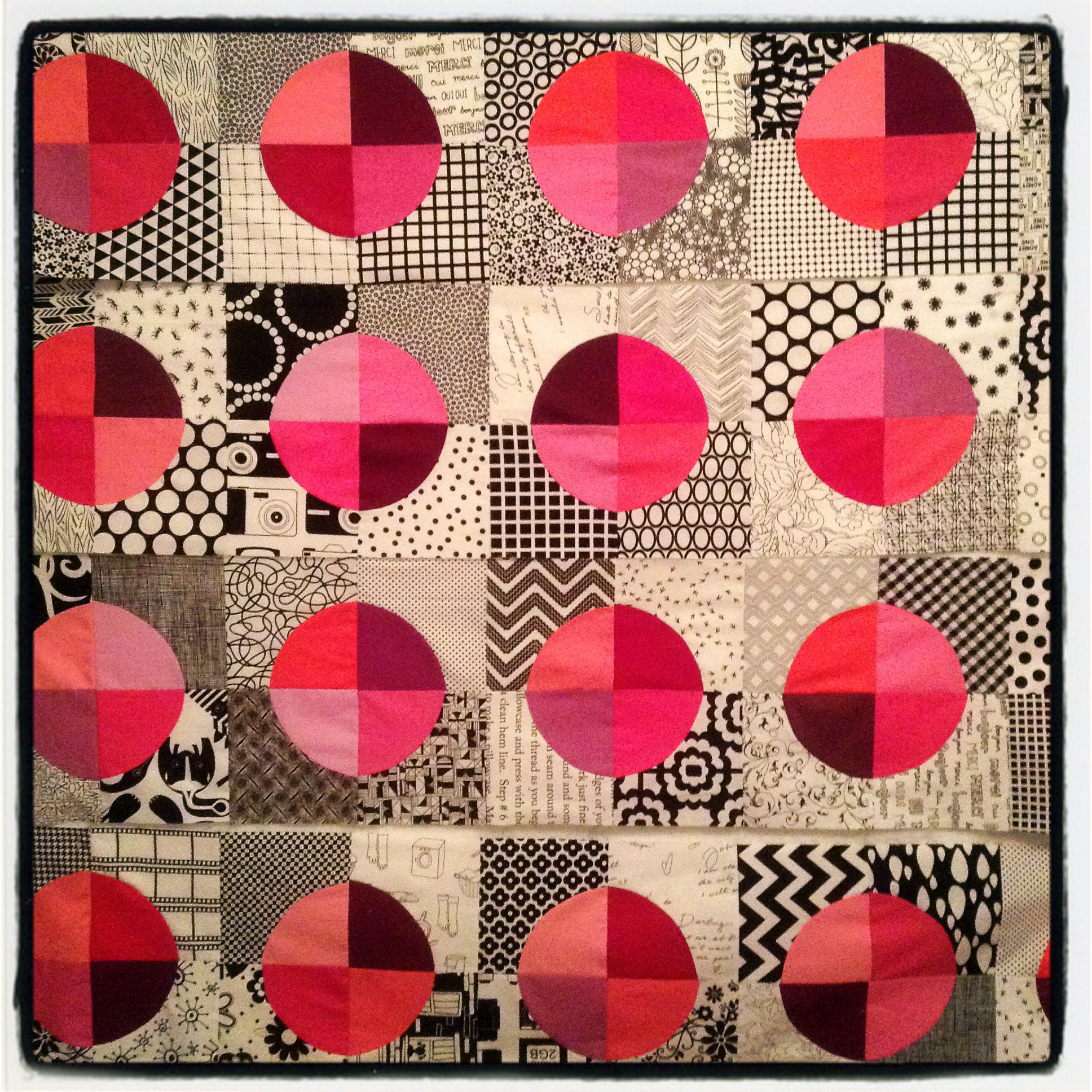 I played a little with proportions on this block, making the black and white background blocks larger than the background blocks of the previous quilt.  I think the solid circles hold their own well against the scrappy.
