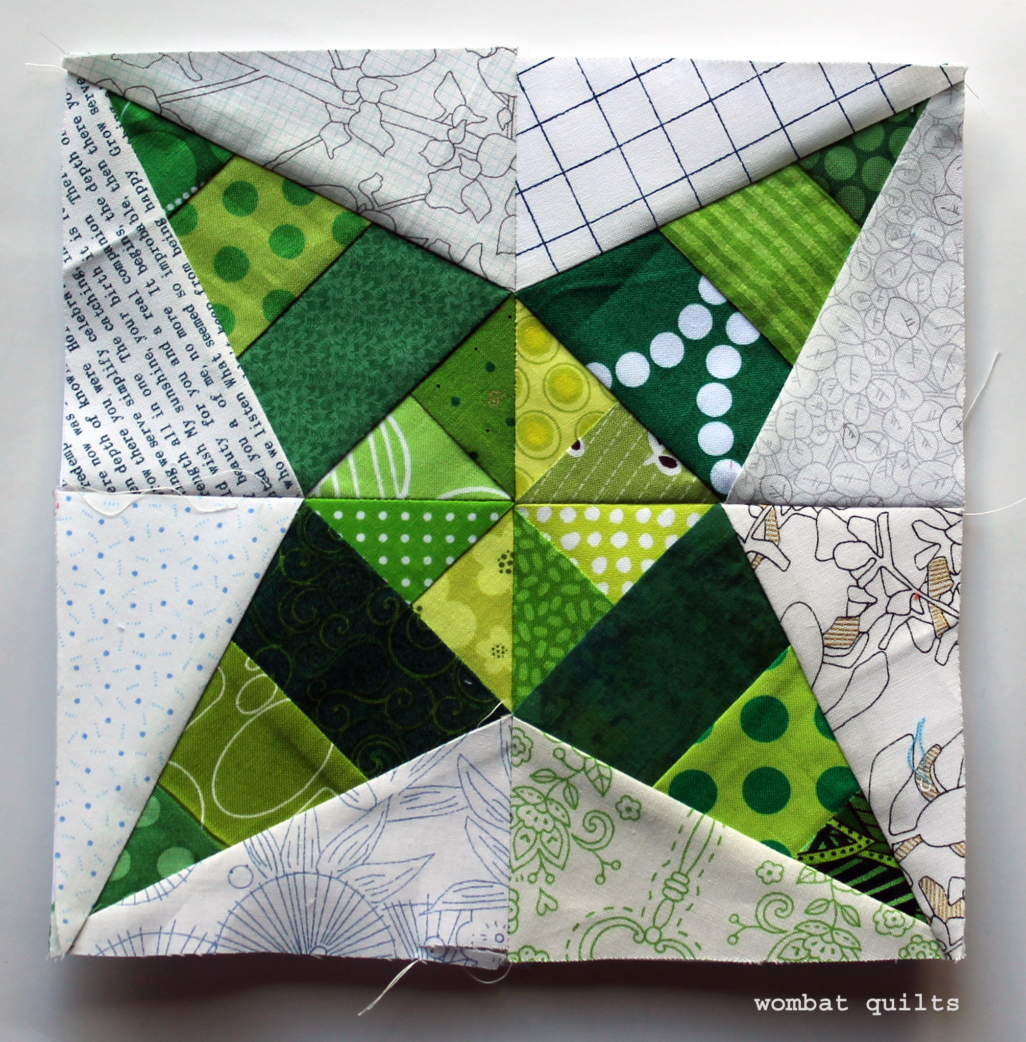 block piecesYou can find the free paper piecing pattern for this 8 inch block here…Stripey Star pattern.  Only a few more green blocks to go and then I can star putting this top together.