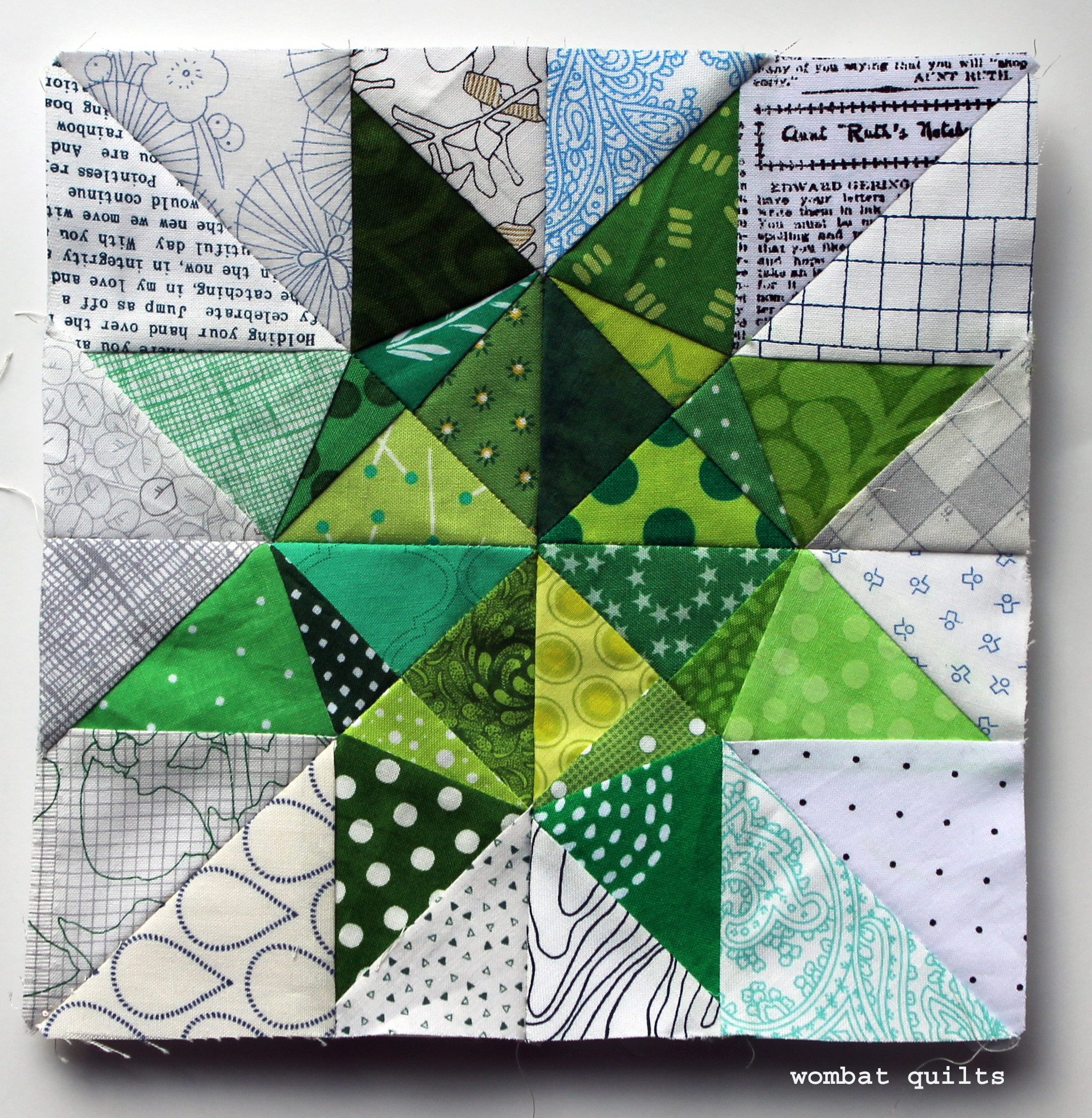 There is no rhyme or reason for my colour placement on this star… I just had fun and put scraps where ever they fitted. Some how it seemed the thing to do with this the 20th star in the series. Yep you read that right, I made 20 green stars and shared 20 patterns.