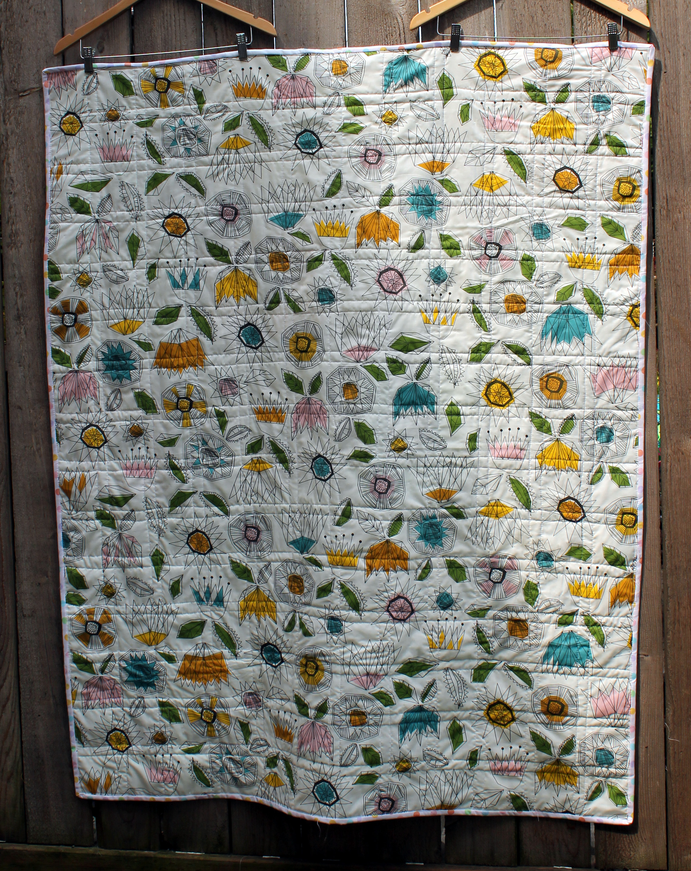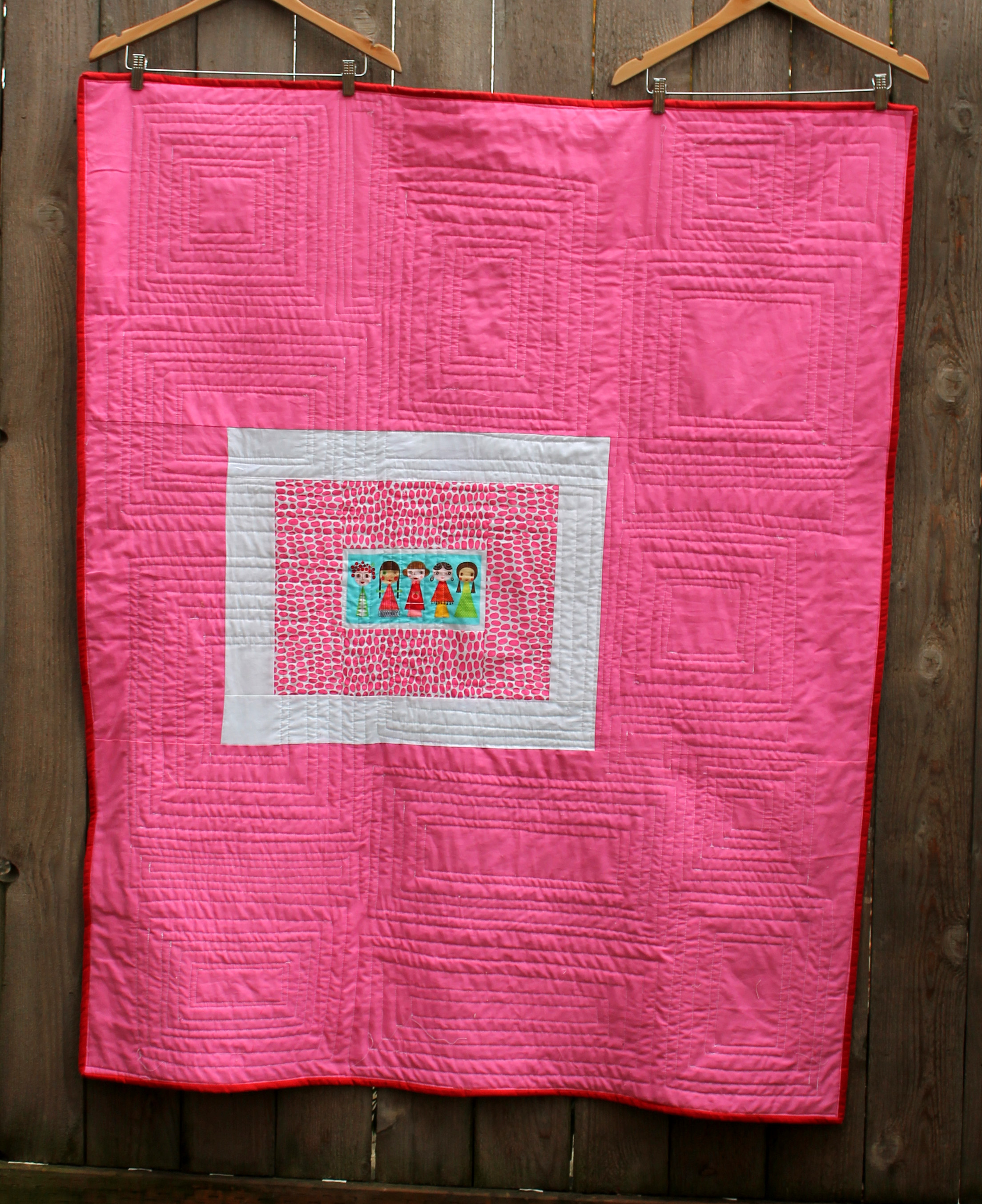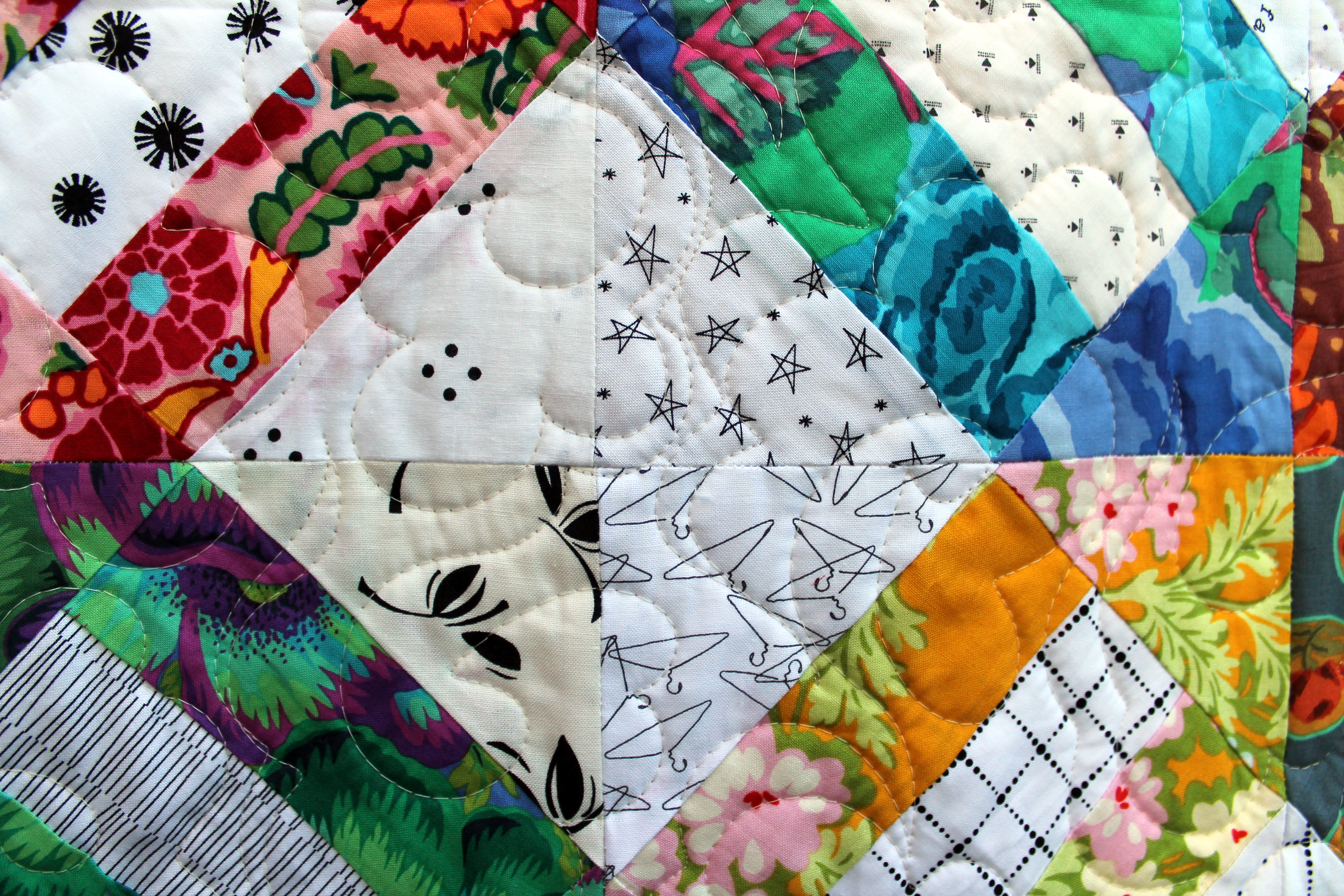 This quilt was made, along with a larger version, at one of the Portland Modern Quilt Guild Charity Sew days. This was a fun day where I bought a huge box of blue scraps, a smattering of white and grey scraps and we all made log cabins.