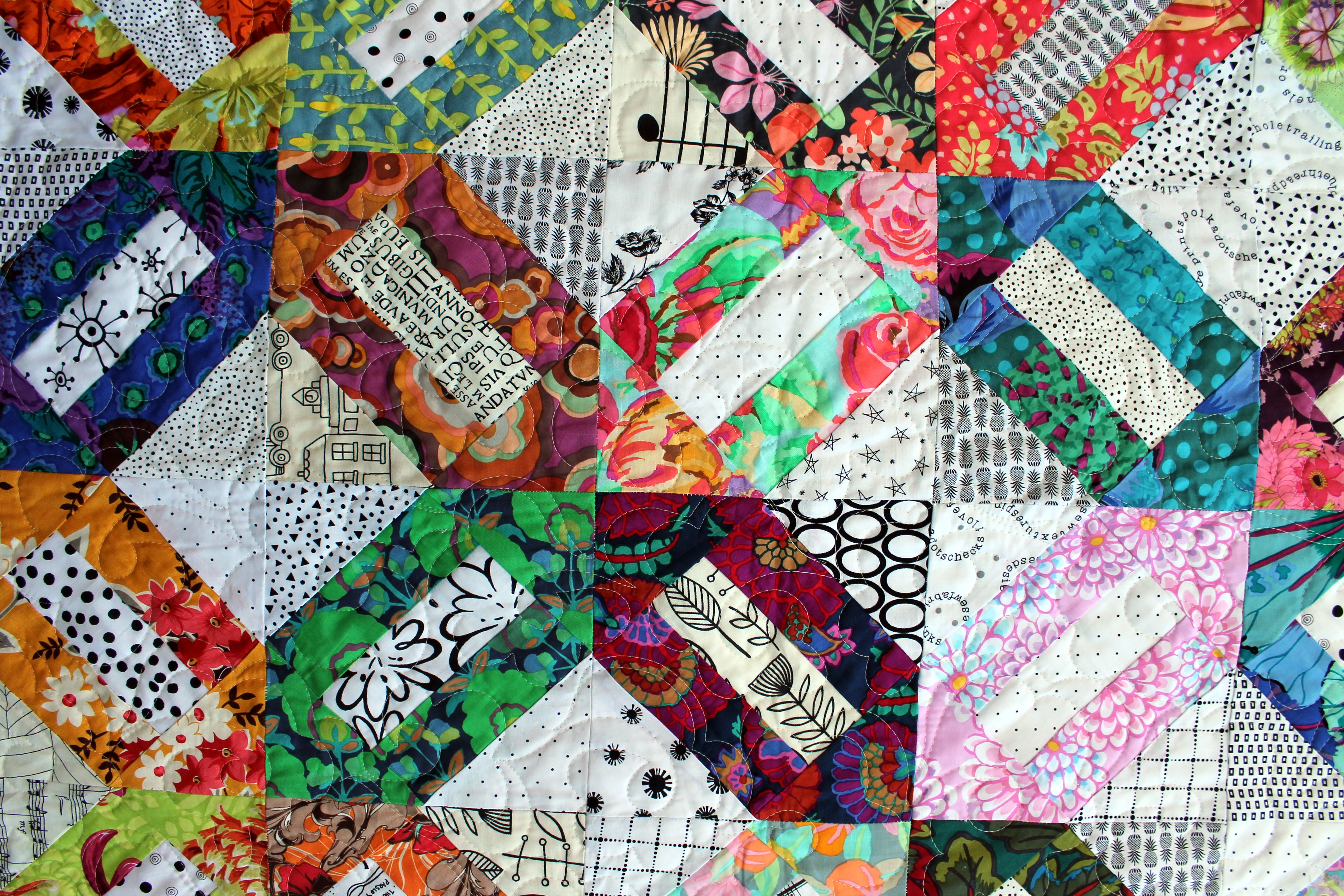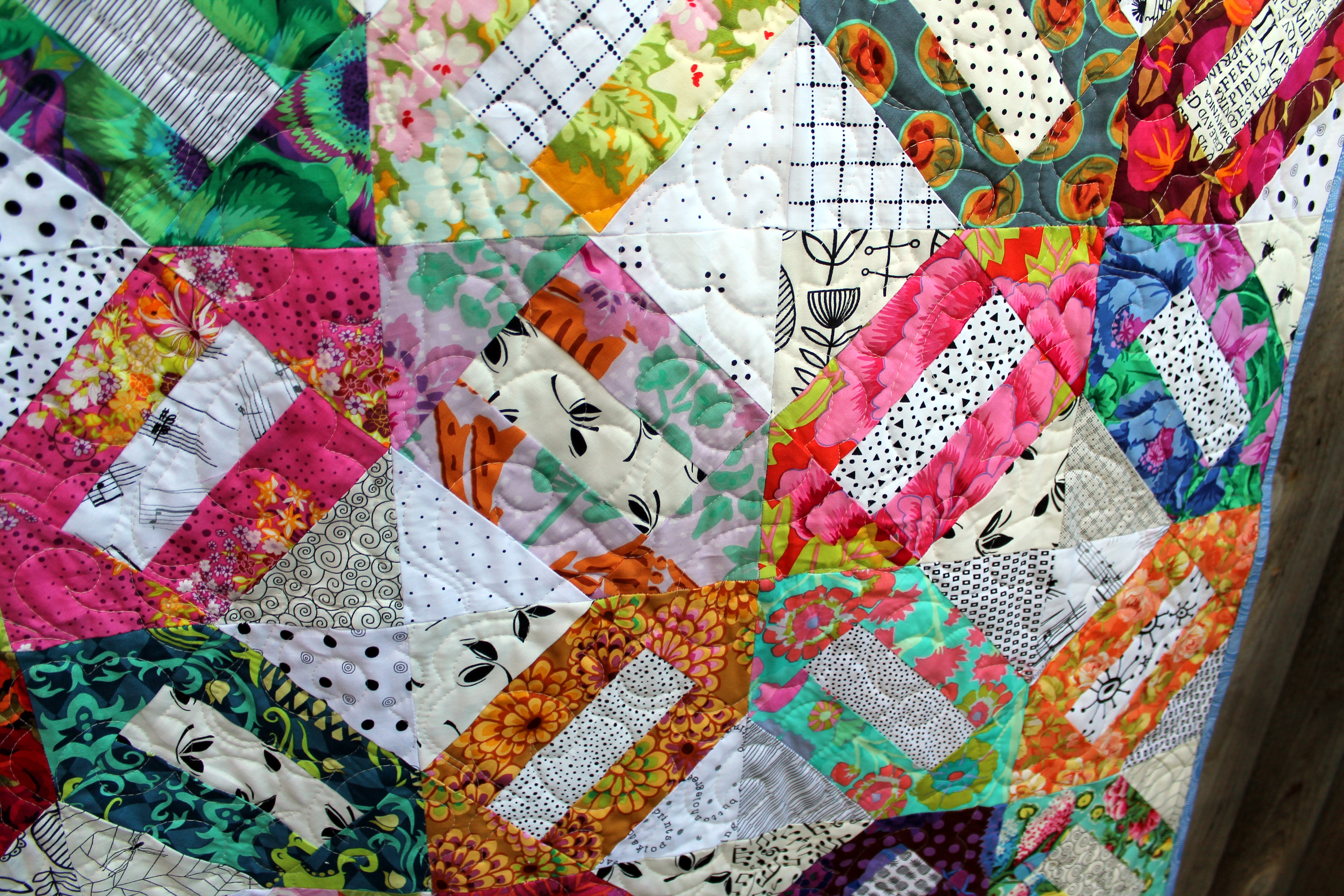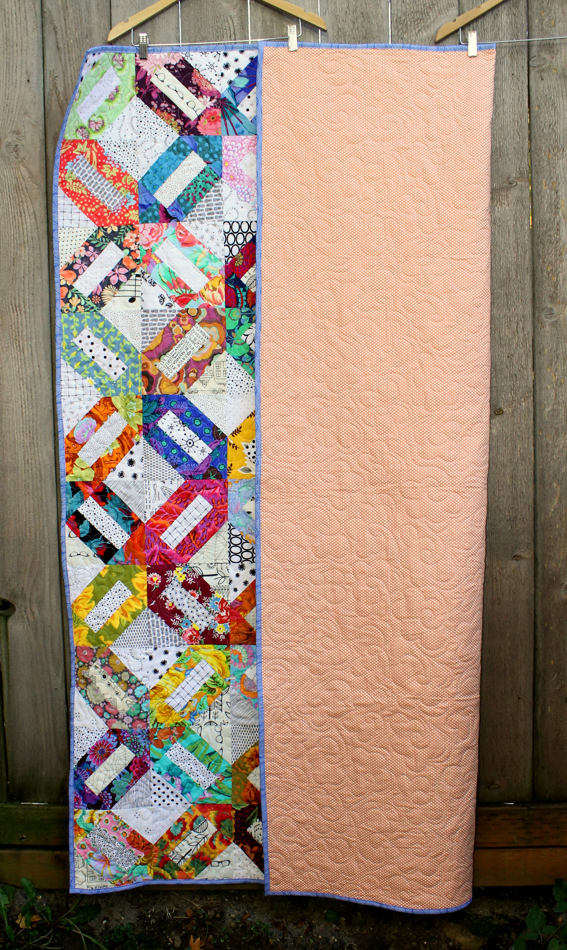 The orange really makes the quilt sing. All the improv log cabin blocks are trimmed to 12 inches finished and this four by four version of the quilt is headed to Project Linus. The larger version of this quilt (six by seven blocks) is currently out with one of our talented long-armers.