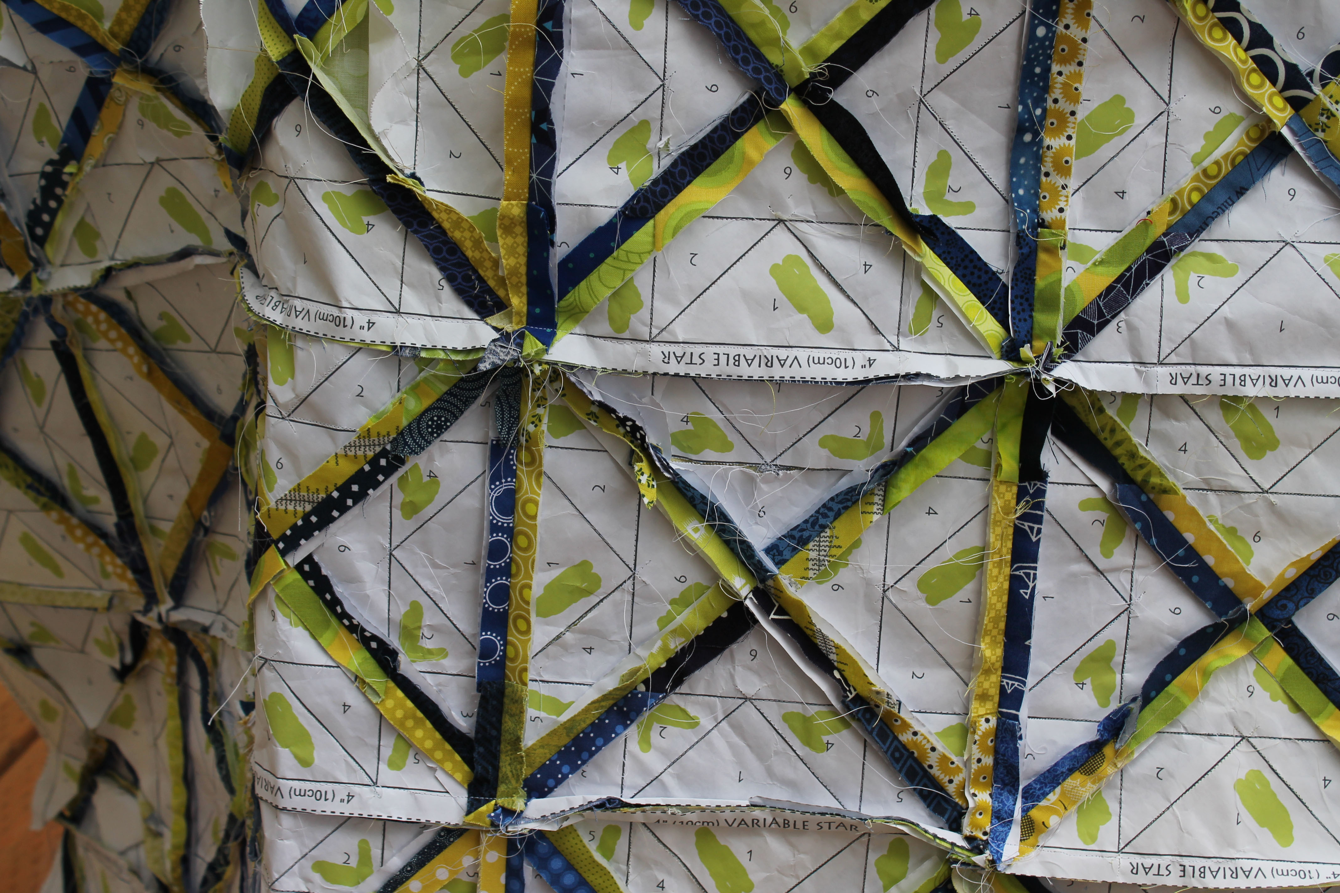 The 5 inch squares were used for the center pieces of the block, the background of the quilt plus I cut a number of the squares diagonally and used these triangles to make the star points. Wonky star quilts really are so ridiculously easy.