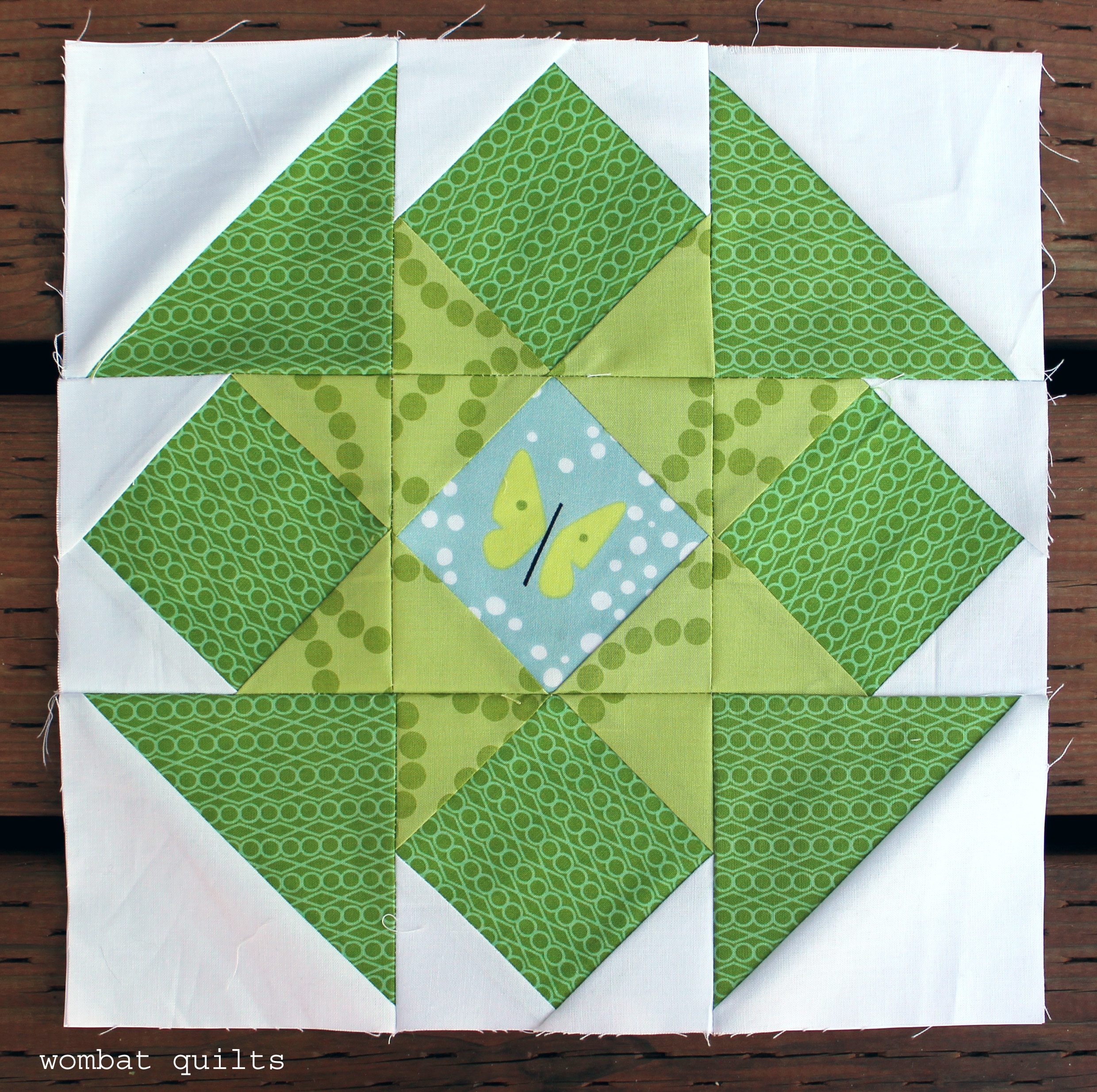 Four WQ Simple square block and four chocolate block components. Then a center block, fussy cutting is, of course, optional!