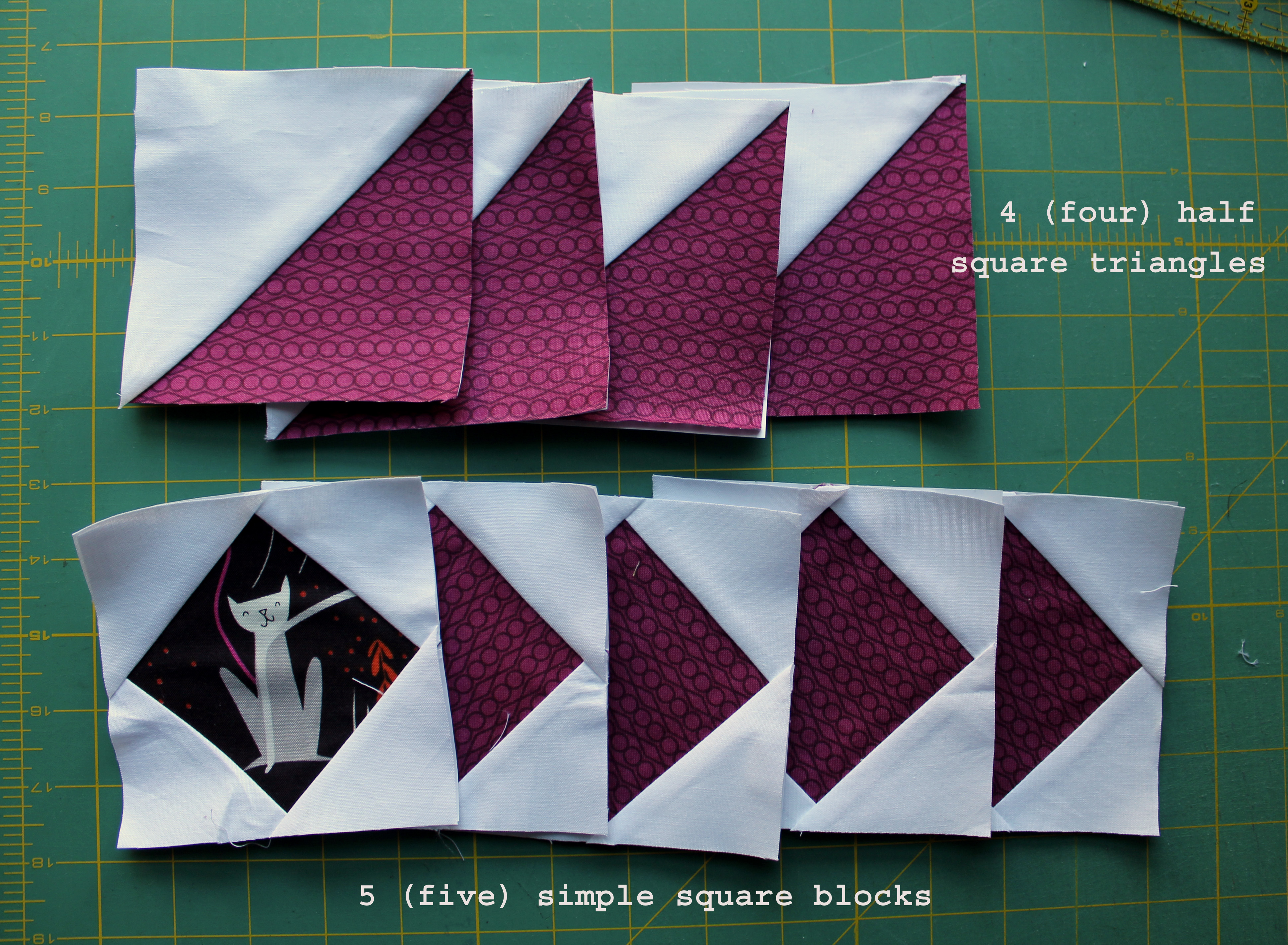 To make this block all you need is the 4 1/2 inch simple square pattern (WQ Simple square block) and the Kitty corner component.