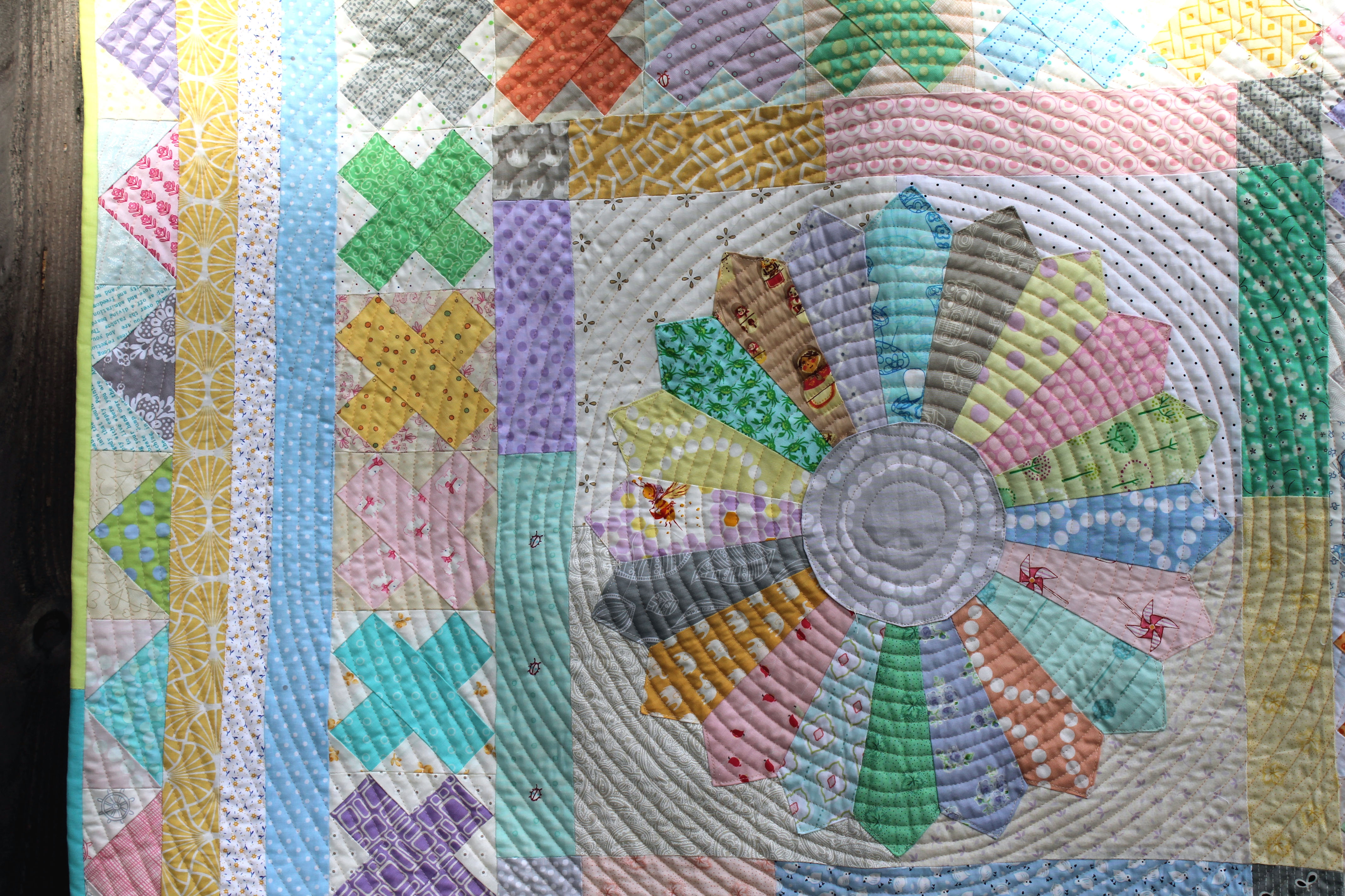 Just for fun I try and fit in Lizzy House’s Pearl Bracelets or Michael Miller’s Mirrorball into my Bee blocks, if I can. I have a friend who tries to get Denyse Schmidt’s Chickopee into her Bee blocks.