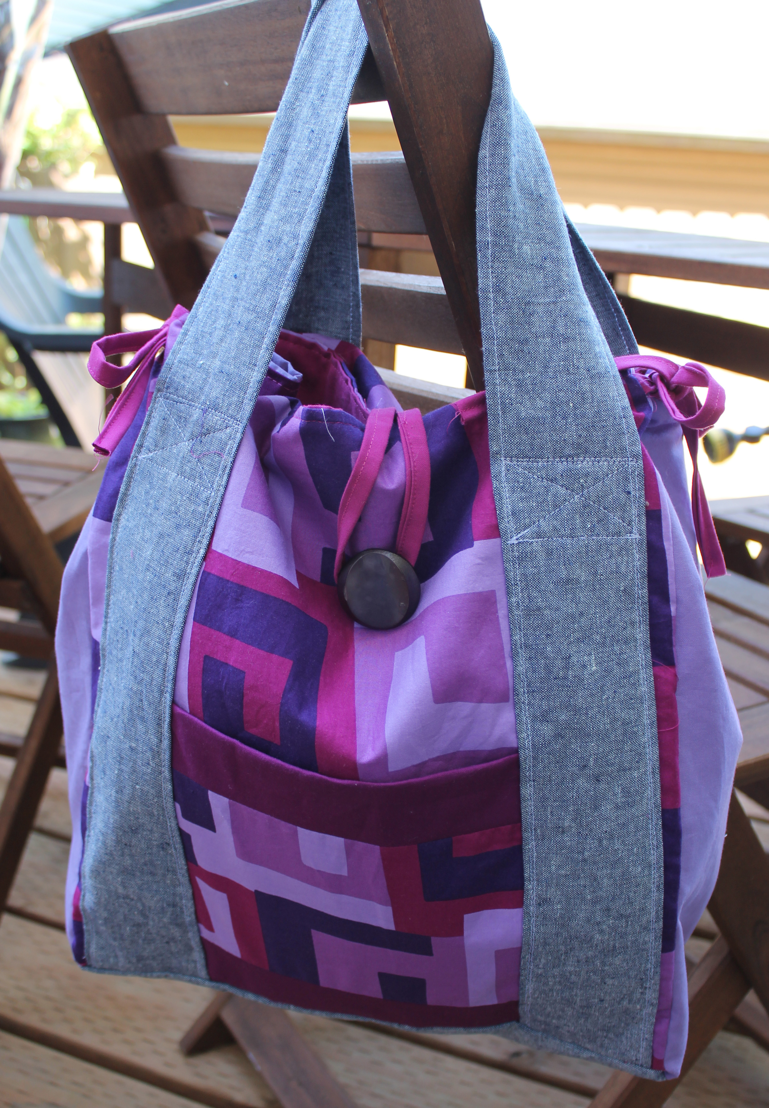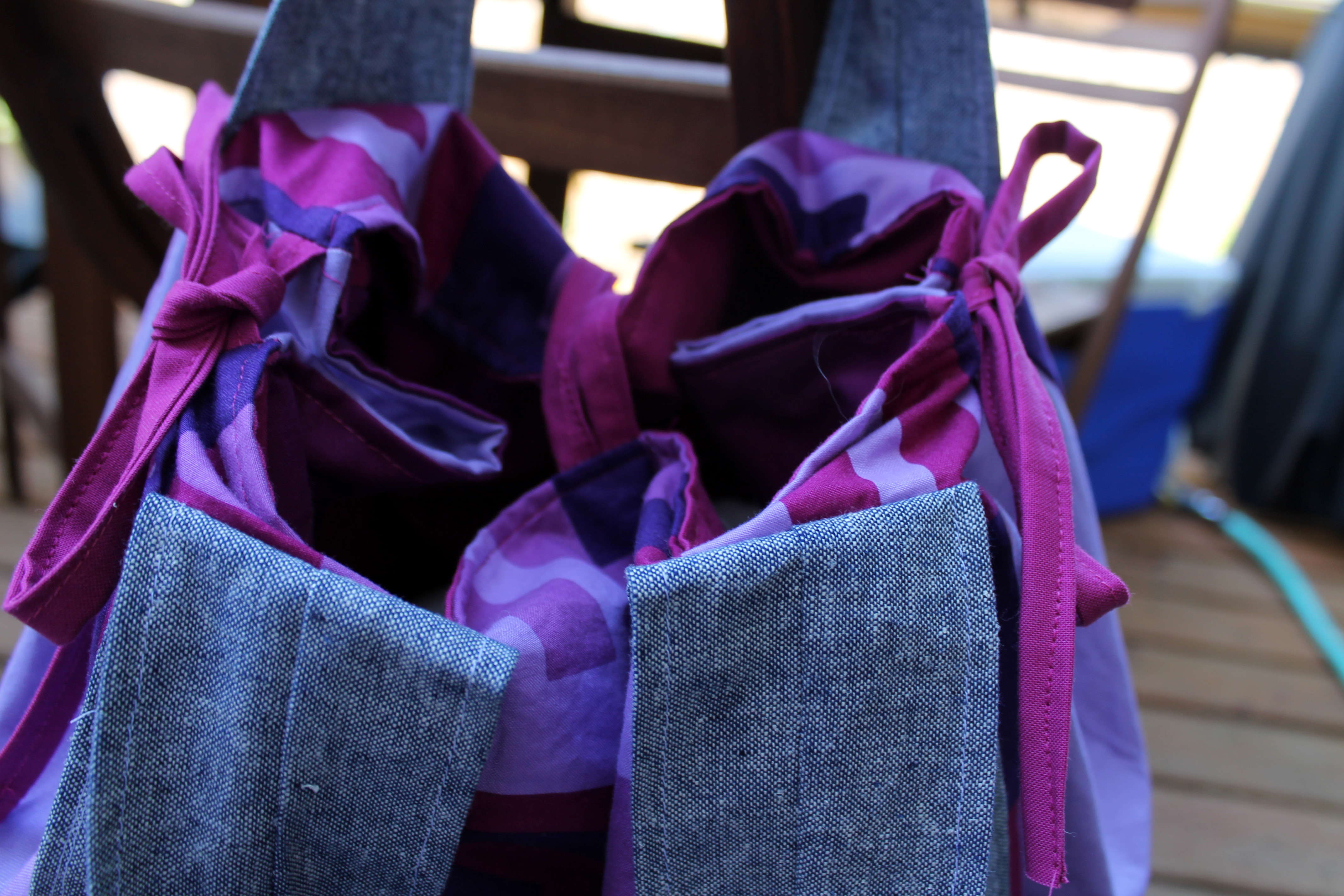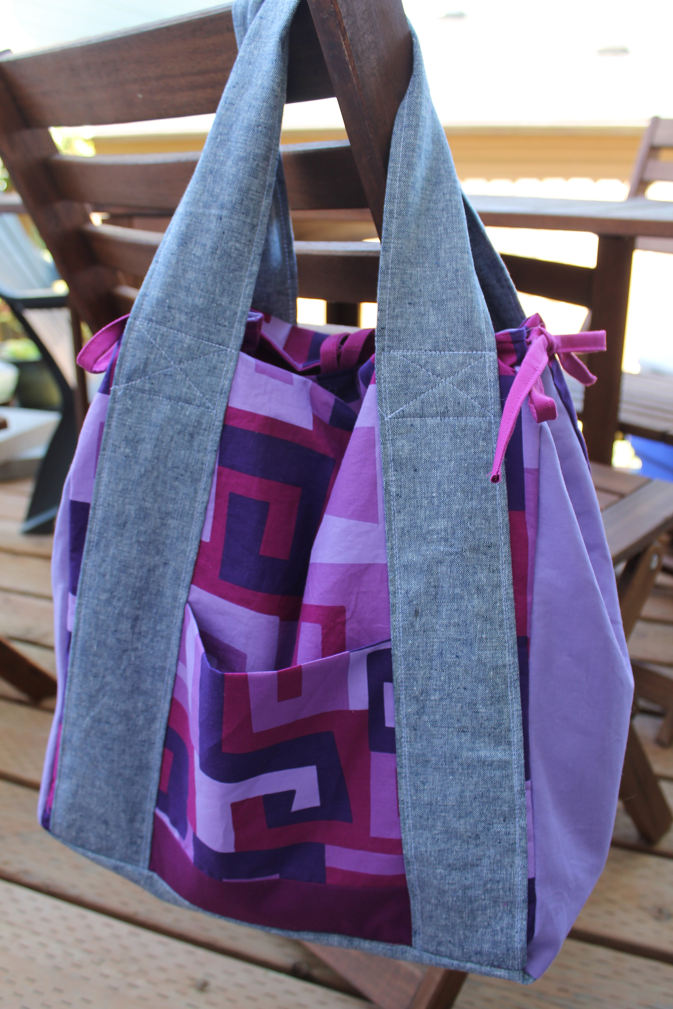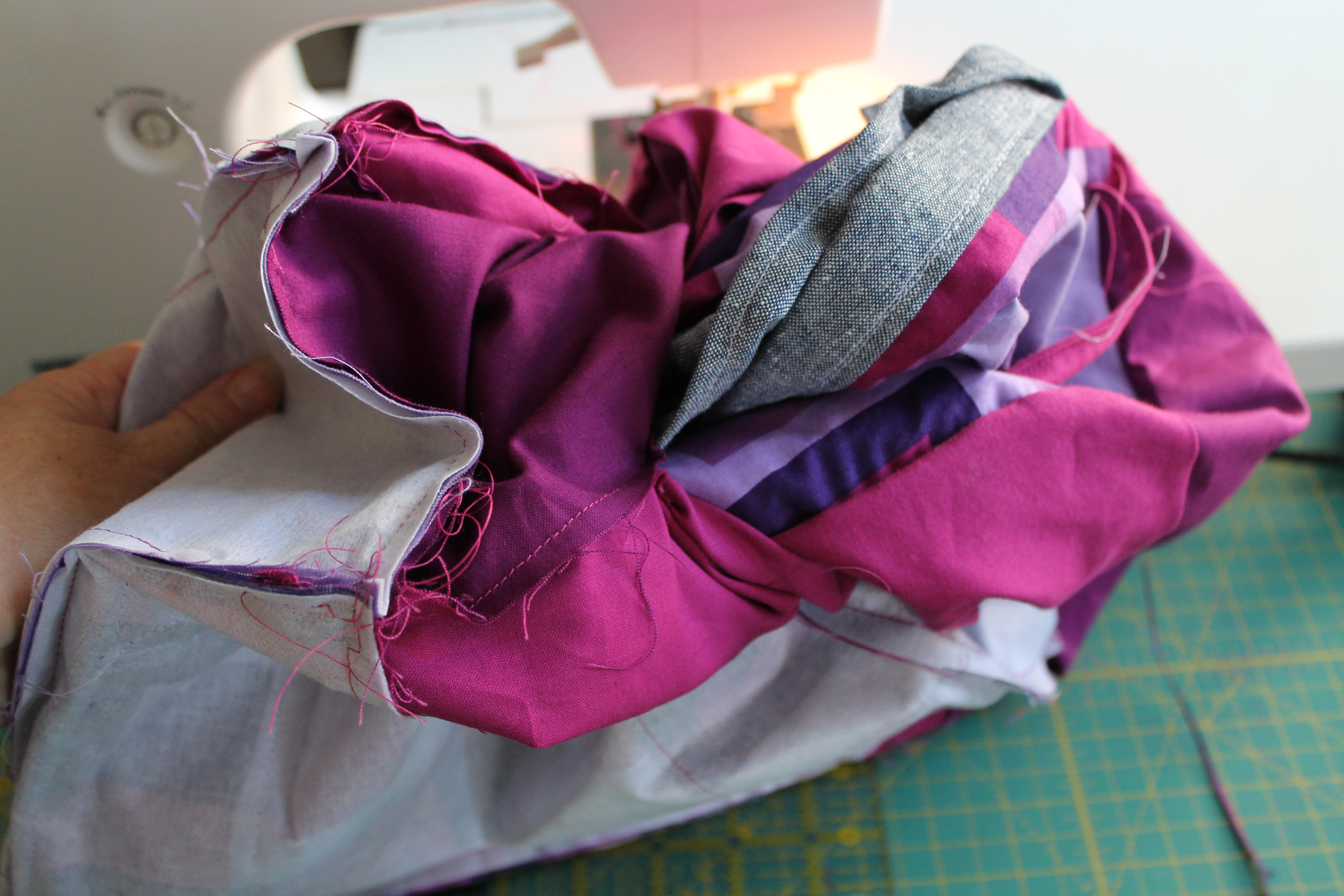 To tone down the fun, loud feature fabric I made the bag gussets out of solid purple…