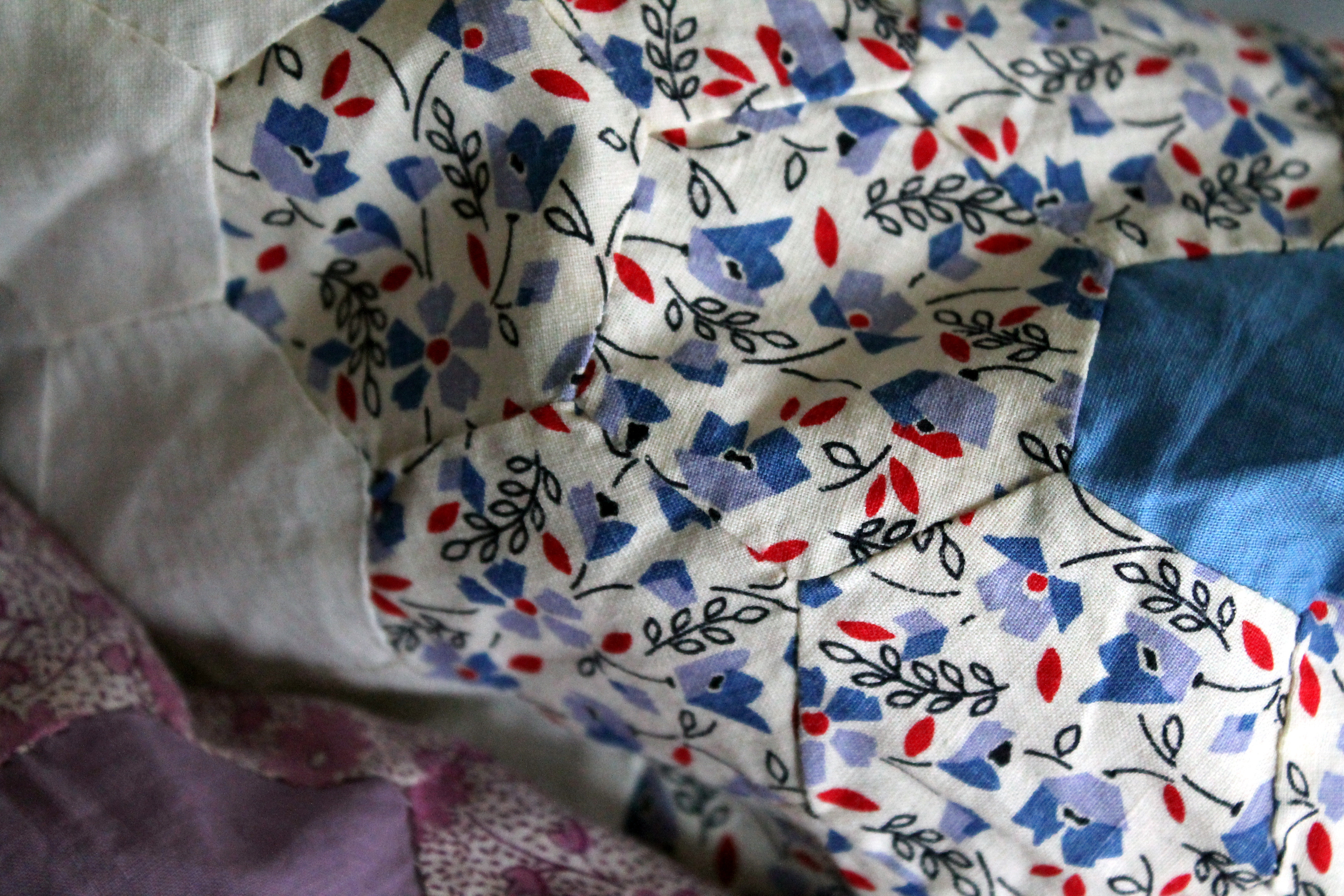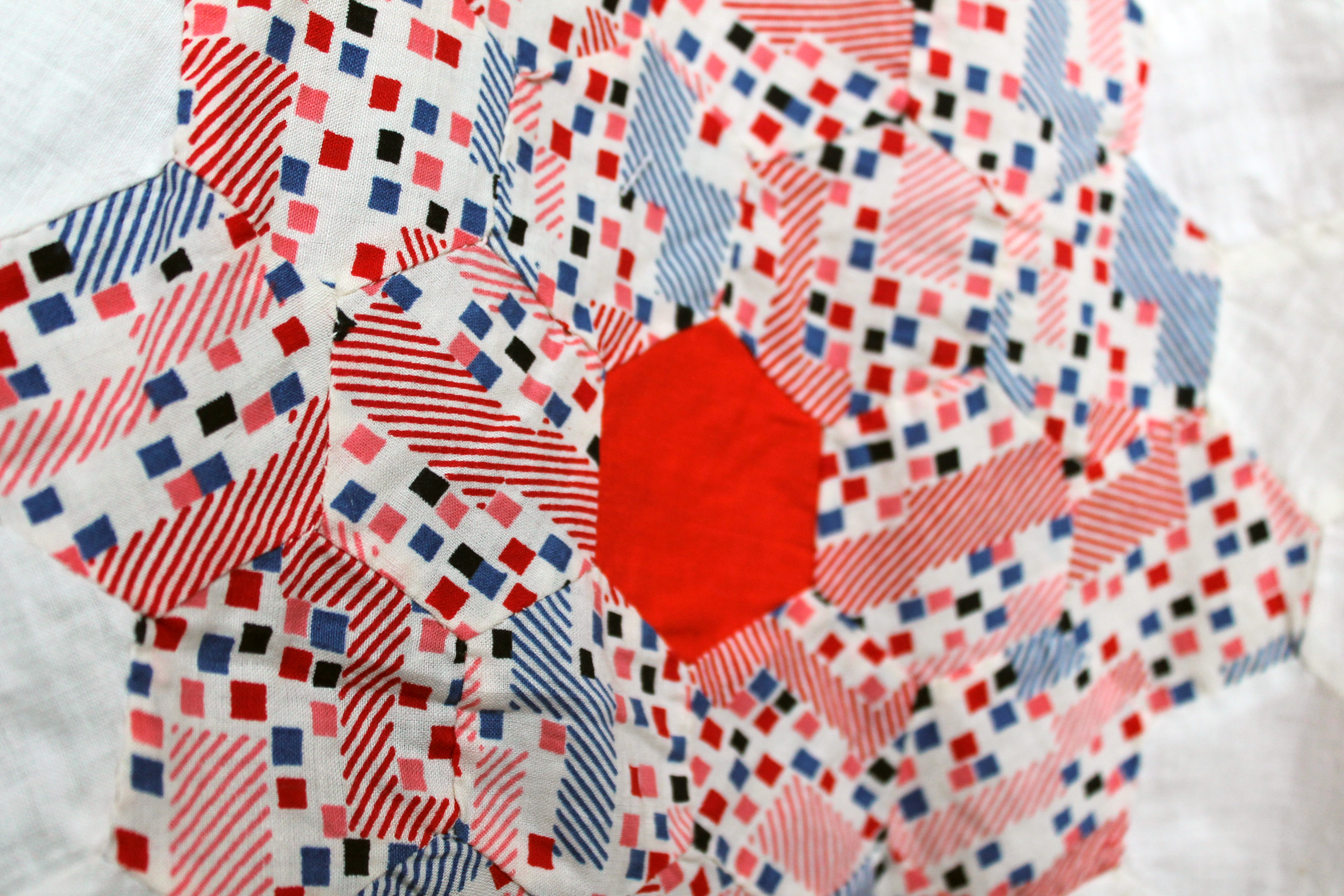 hexagon quilt detail 4 nov 2013But the newest hexagon addition to the family is an amazing vintage hexagon top I picked up at a local thrift store for $10.