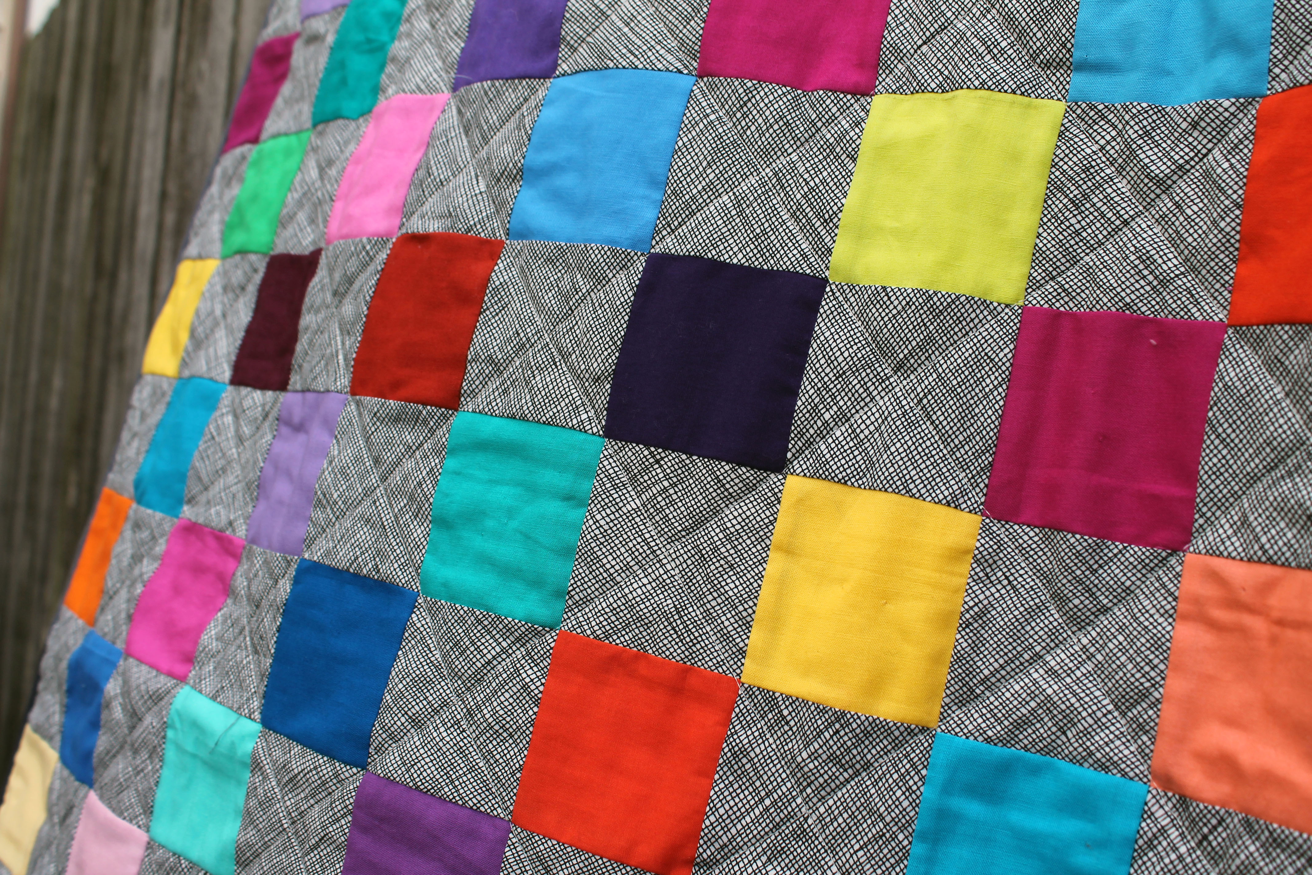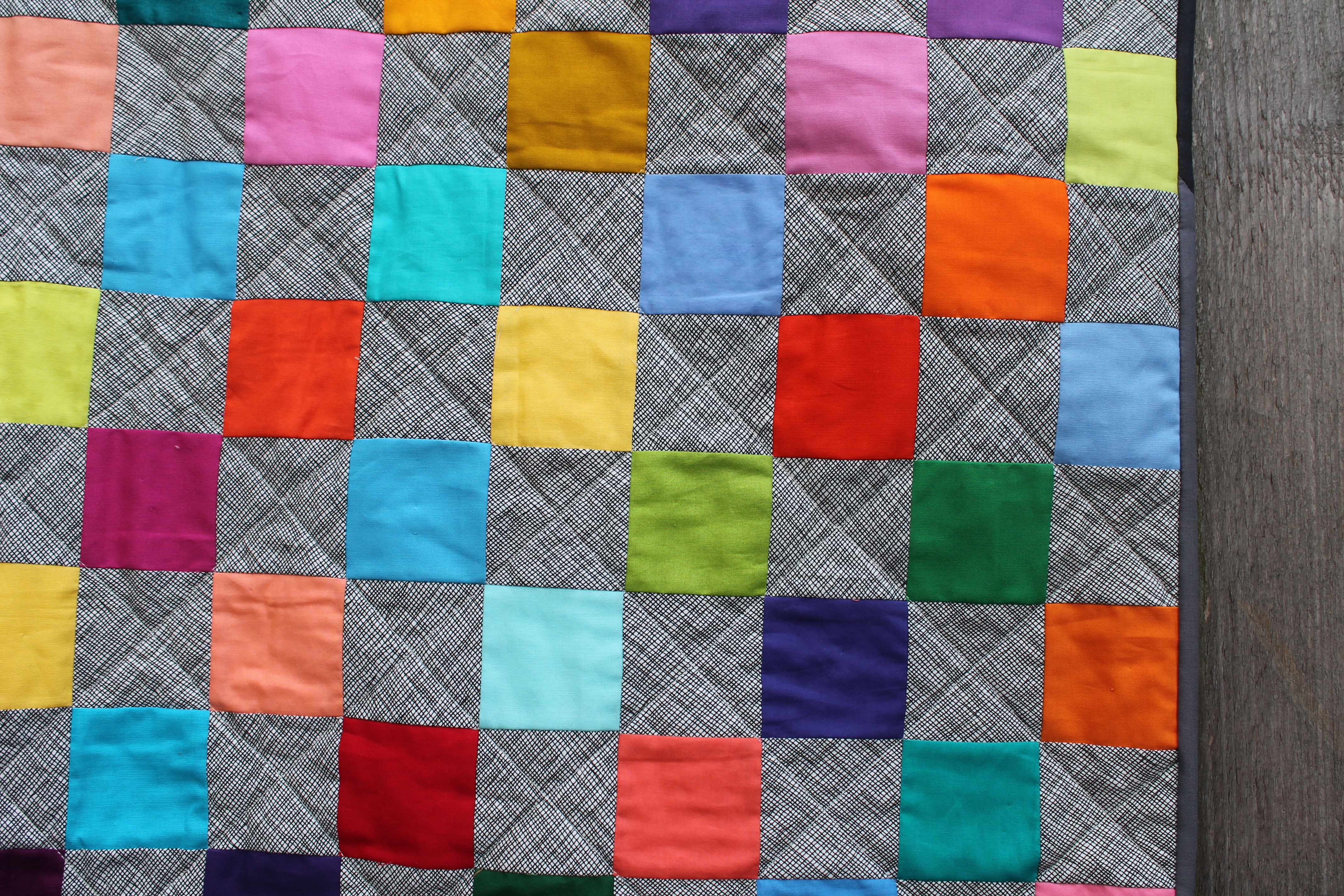 For all my wonky star quilts I did simple straight line quilting, but with this quilt I used a variegated thread I found in my thread box. I kind of love how it turned out…